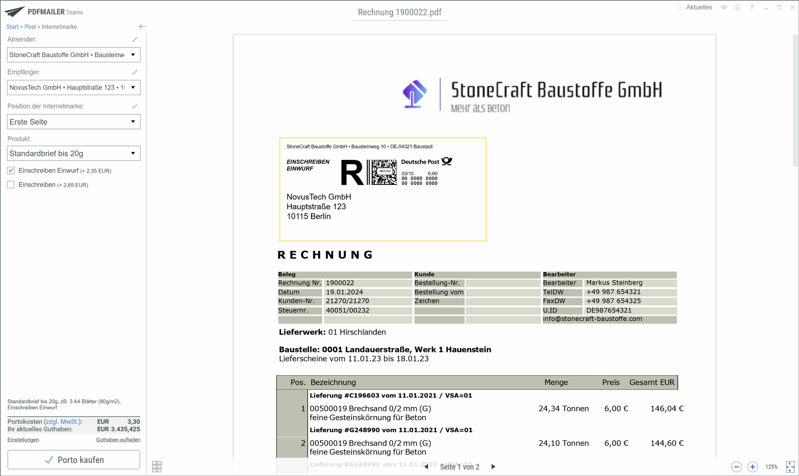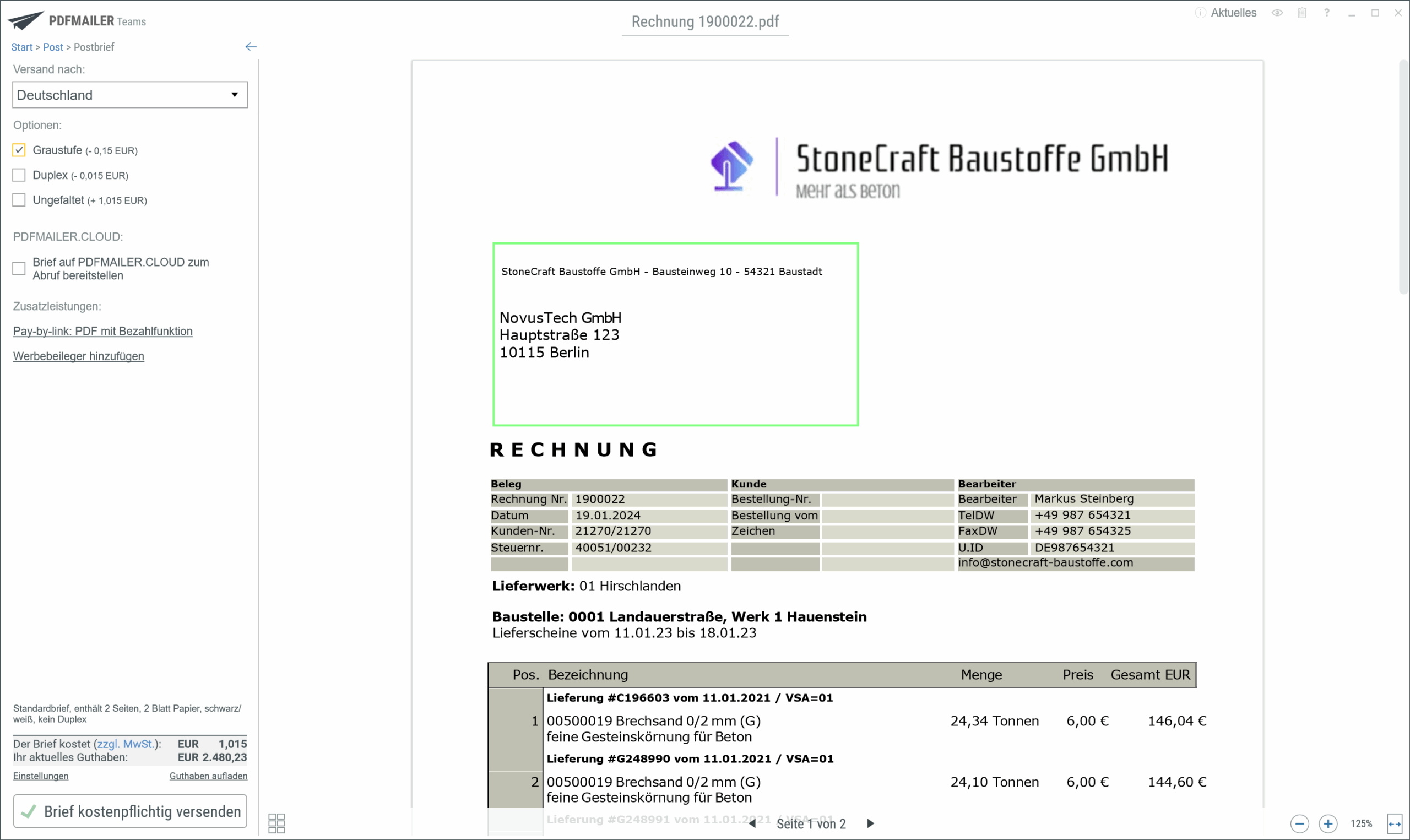 Ja. Mit PDFMAILER.SEND versenden Sie nicht nur E-Rechnungen, sondern auch Briefe, Verträge, Angebote und andere Geschäftsdokumente – direkt per E-Mail oder als klassischen Postbrief, national und international.