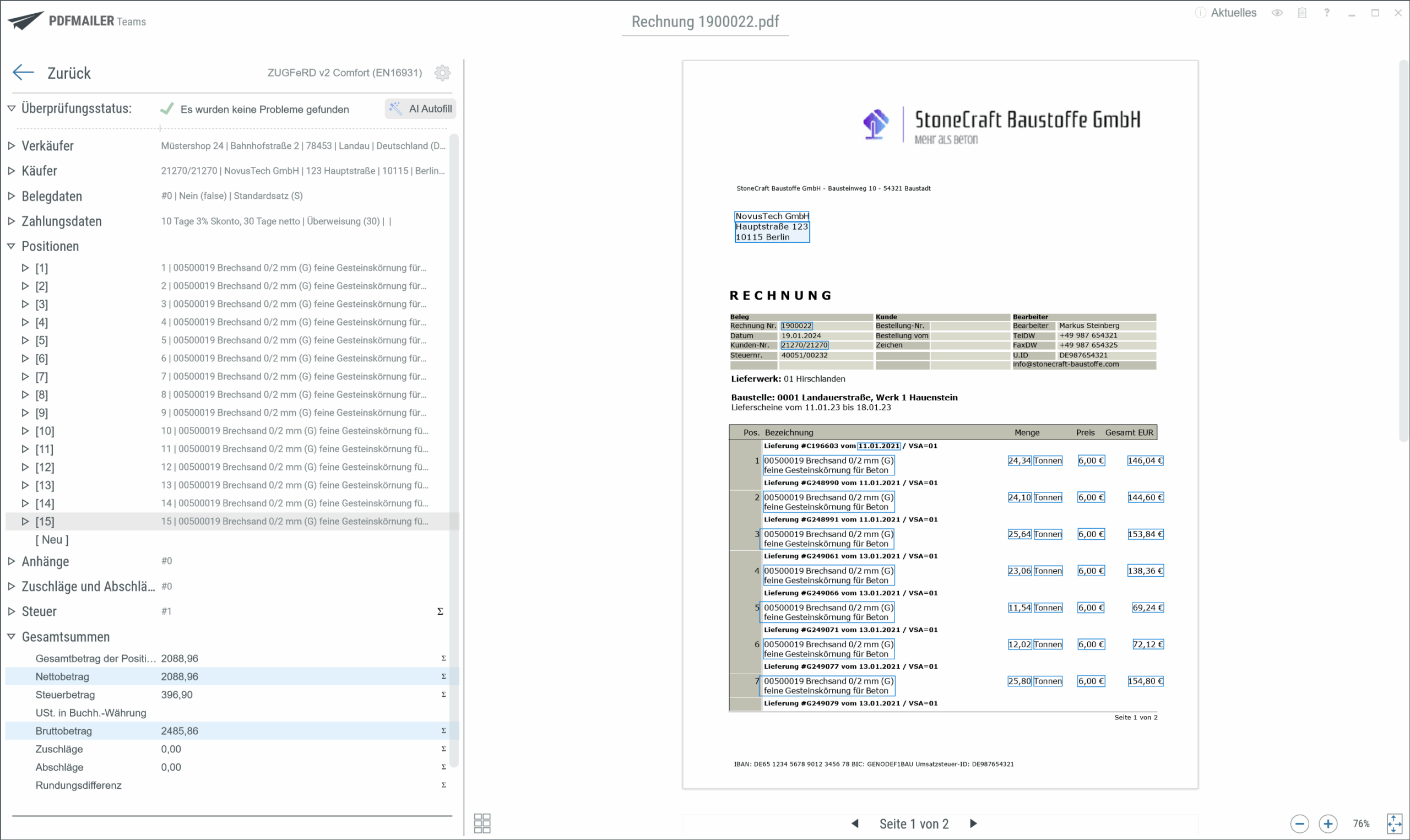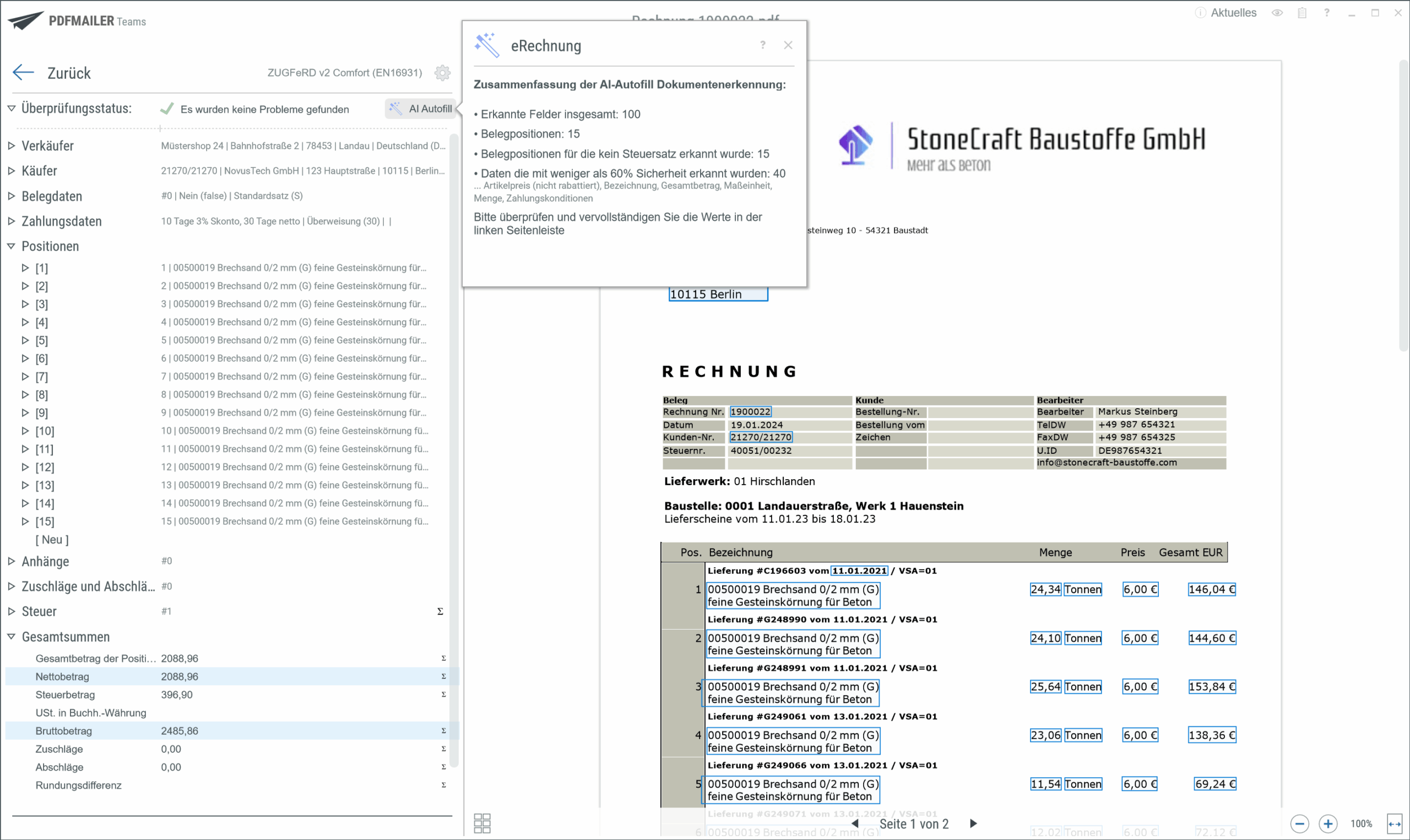 PDFMAILER nutzt KI, um Rechnungsdaten automatisch aus Word und Excel zu erkennen und die erforderlichen E-Rechnungsfelder zu befüllen.